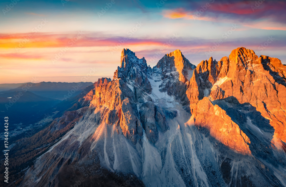 Spectacular autumn sunrise in Dolomite Alps. Great morning view from flying drone of Cimon della Pala peak, Italy, Europe. Beauty of nature concept background. #1744244243