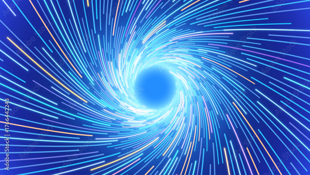 Speed Of Light Travel Tunnel With Glowing Lines In Spiral Motion. Hyperspace Vortex Concept, Futuristic Data Flow Background. Time Travel Teleportation Effect. Vector Illustration. #1766442243
