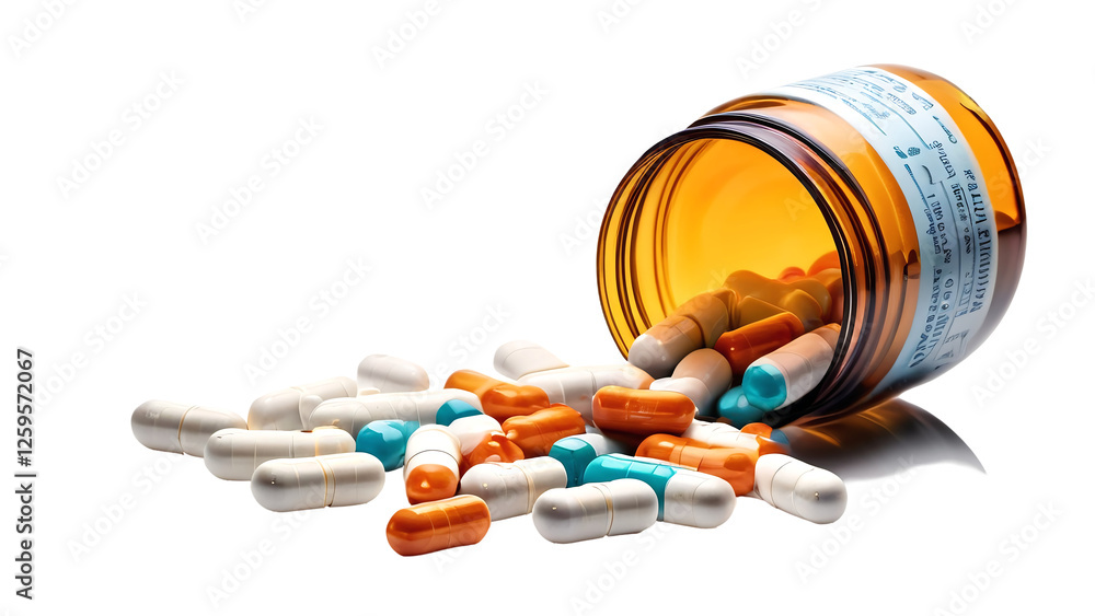 Spilled Pills from Amber Bottle on Black Background #1259572067