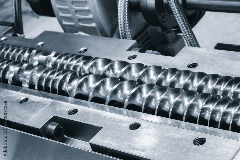 Spiral screw shaft for feeding granules into production machine for manufacture products from pvc plastic extrusion technology, industrial concept background #1949074258