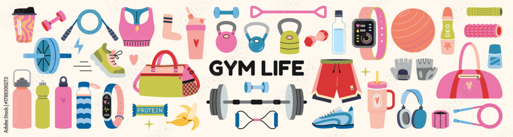 Sport accessories, workout clothes and Gym equipment set. Fitness, strength and healthy lifestyle concept. Trendy modern vector illustration isolated on background, hand drawn, flat design #1788300273