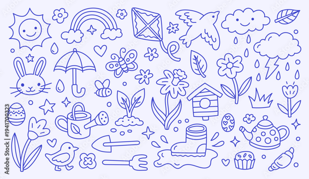 Spring, Easter doodle collection with hand drawn line art garden elements, bunny, flowers, rainbow, sun. Vector icons for gardening, weather, nature. Cute illustrations for kids cards. Editable stroke #1941700323