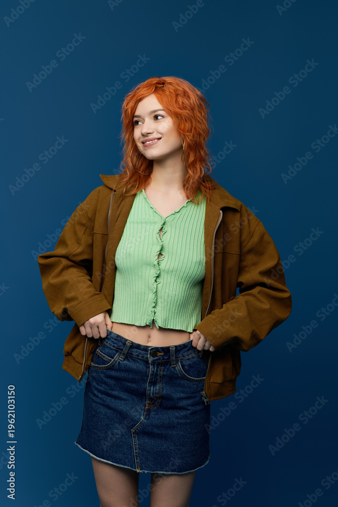 Spring fashion with a young woman and vibrant red hair on a blue background #1962103150
