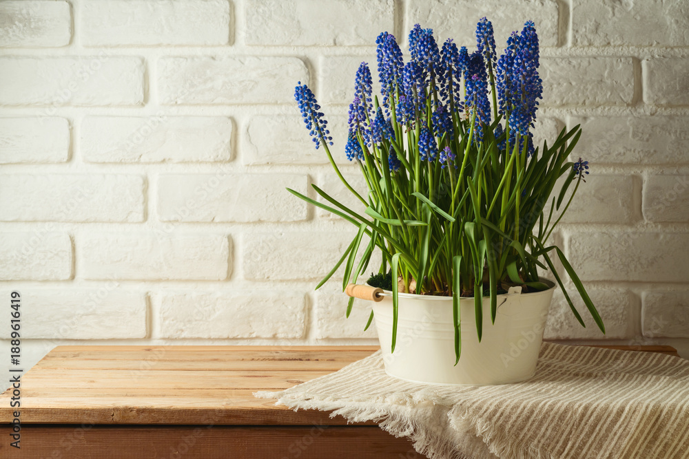 Spring muscari flowers in bucket on wooden table over brick wall background #1889616419