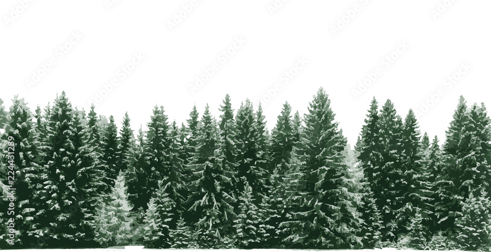 Spruce tree forest covered by fresh snow during Winter Christmas time. The winter scene is duotone with limited palette colours. Vector illustration. #224431289