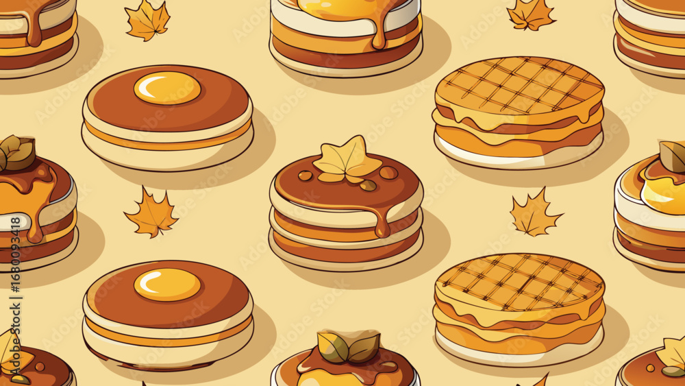 Stacked pancakes with syrup and autumn leaves pattern on a cream background breakfast #1680093418