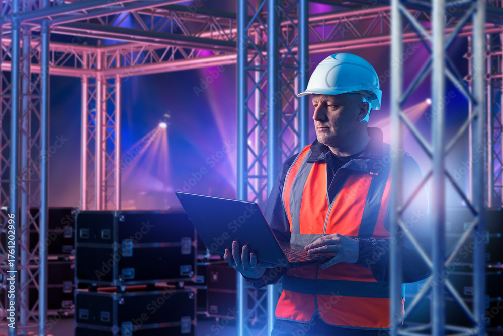 Stage construction supervisor with laptop monitors truss installation, managing lighting structures, safety, and technical setup for live events. #1761202996