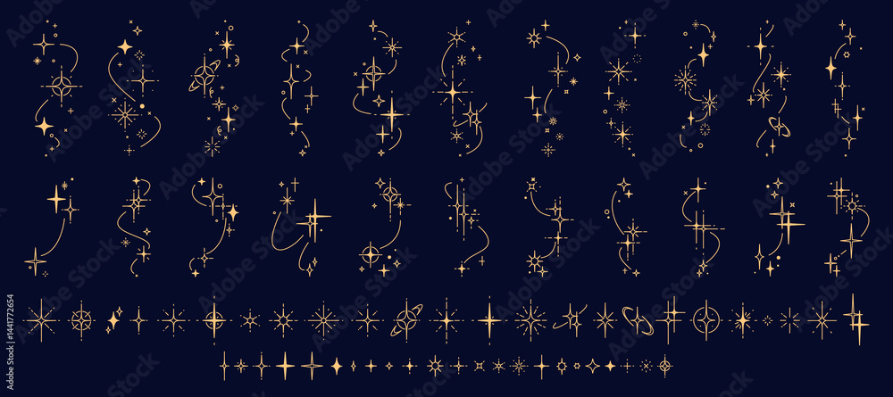 Star constellation sparkle and twinkles, starburst and flash stars, blink glitters vector set. Elegant golden star symbols and glimmers for astrology, celestial, magical, tarot cards and cosmic themes #1441772654