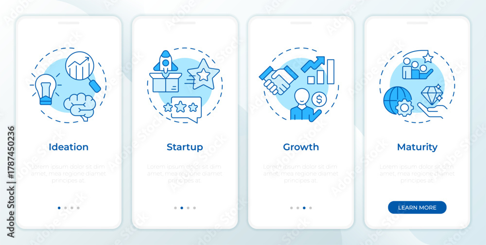 Startup growth stages blue onboarding mobile app screen. Business project. Walkthrough 4 steps editable graphic instructions with linear concepts. UI, UX, GUI. Montserrat SemiBold, Regular fonts used #1787450236