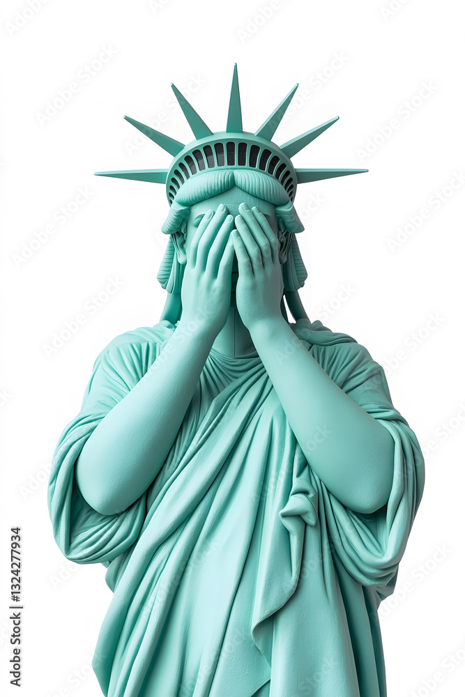 Statue of Liberty shedding tears covering her face with hands in despair #1324277934