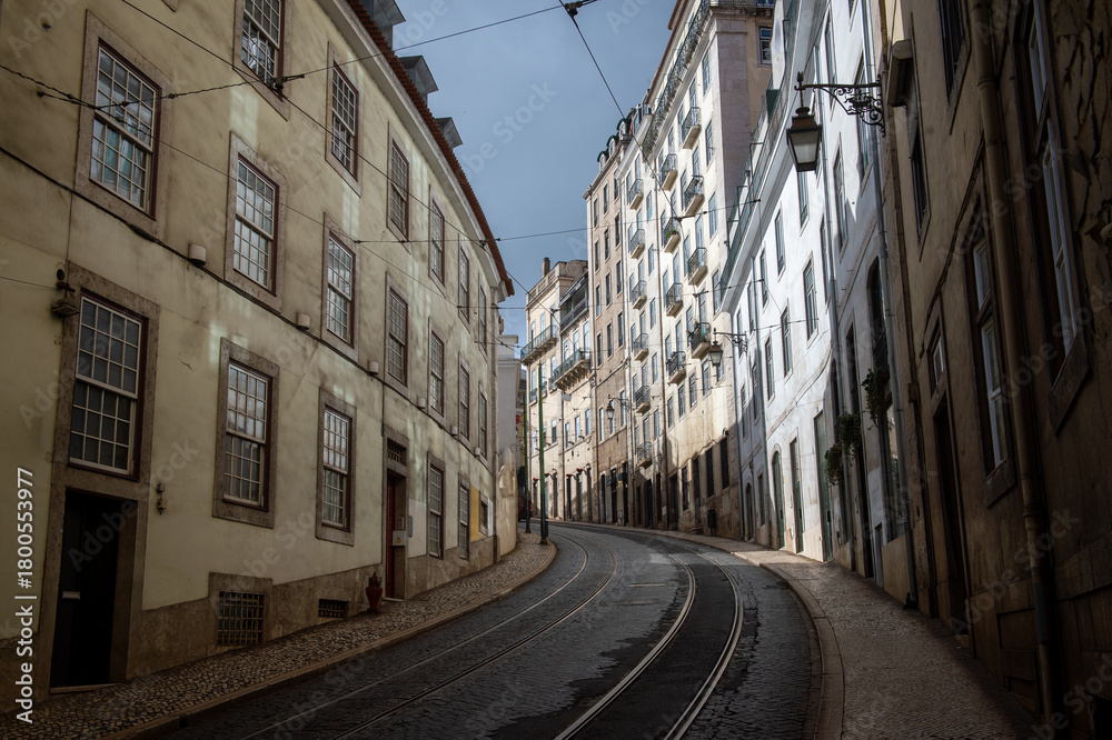 Steep and curving tram-lined street linking the 'Barrio Alto' with 'Baixa de Lisboa' in central Lisbon, Portugal #1800553977