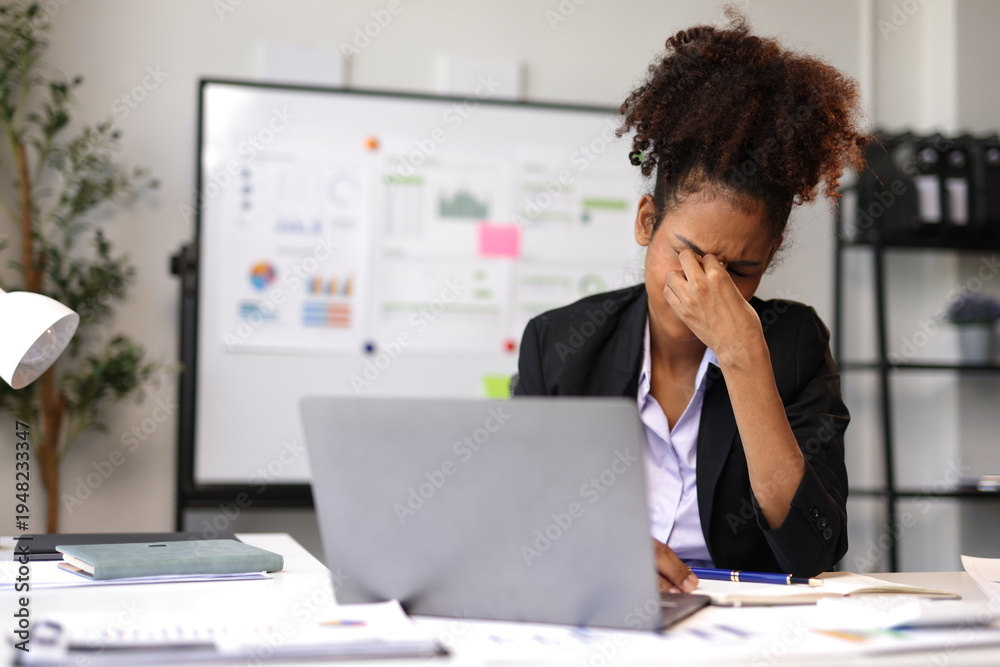 Stressed manager suffering from headache working on laptop in office. #1948233347