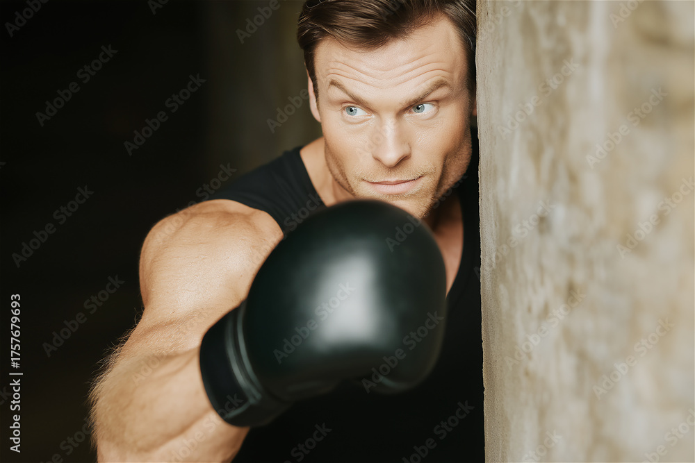 Strong man wearing boxing gloves training in gym, concept of power, strength and motivation with copy space. #1757679693