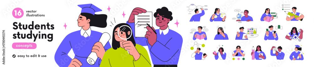 Students studying, learning set. Smart characters, learners writing, thinking, reading books, solving schemes. Education and knowledge concept. Flat vector illustrations isolated on white background #1780445374