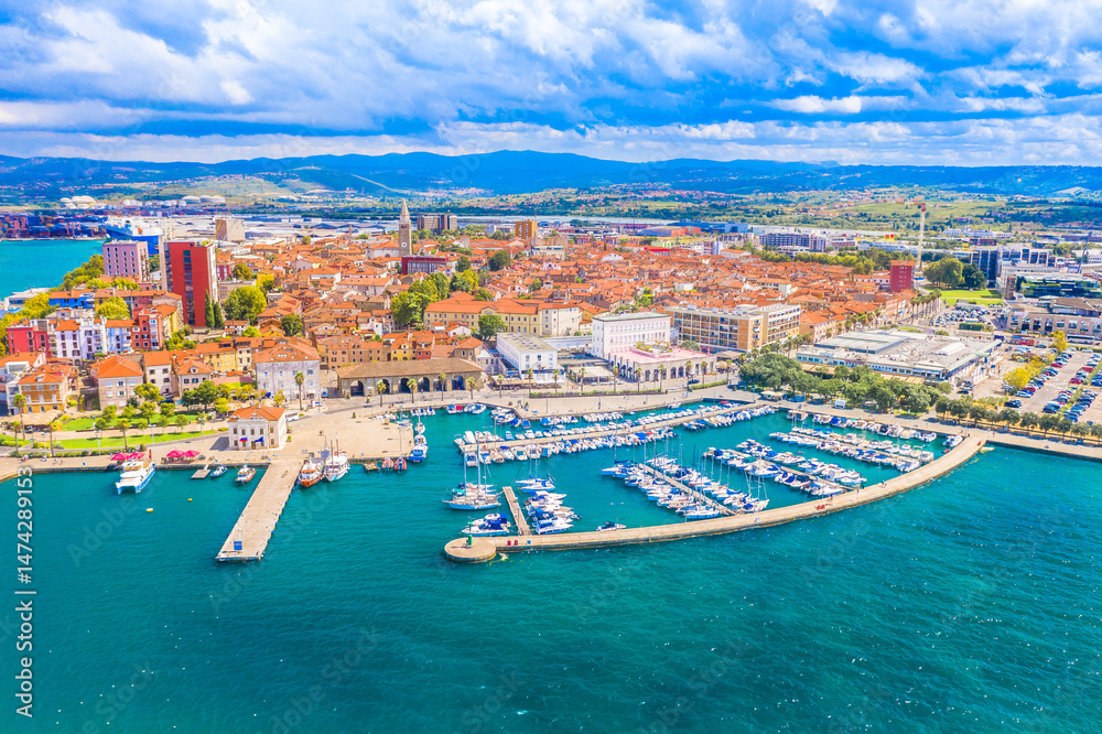 Stunning aerial view of Koper, Slovenia, highlighting its historic coastal core, marina, and the Adriatic shoreline, blending cultural architecture with a vibrant seaside setting #1474289153