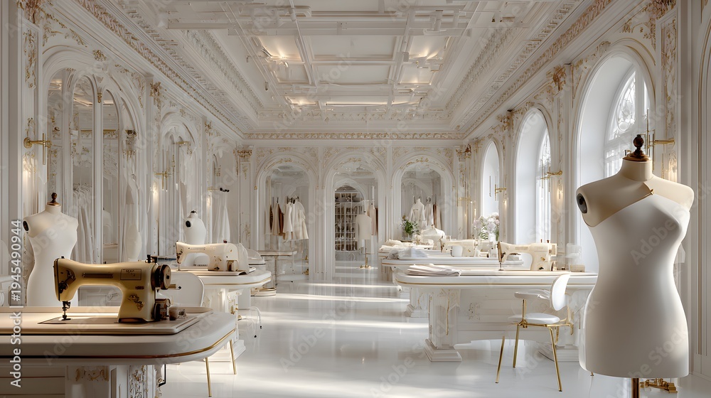 Stunning photorealistic photograph of an empty high fashion design atelier, featuring blank white dressmaker mannequins and fabric rolls. #1945490944