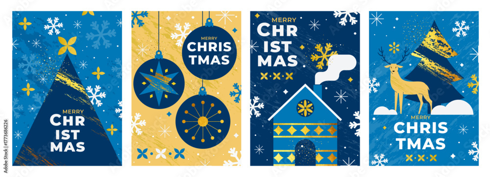 Stylish Christmas greeting cards in blue and gold color palette. Minimal geometric design with house, Christmas tree, snowflakes and ornaments. Perfect for holiday prints and digital cards. Vector #1773686226