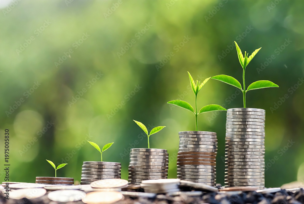 Subject: Growing money, symbolizing financial growth. Action: Coins are growing into plants on stacks of coins. Setting: Outdoors with a blurred green forest background. #1975005830