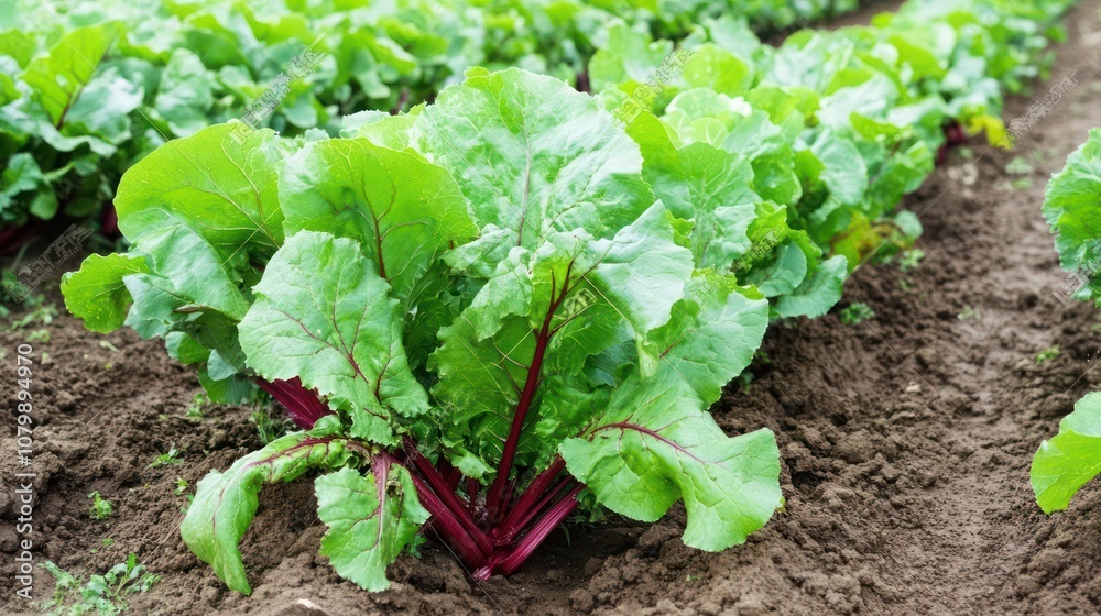 Sugar beet farm in France, organized rows with lush green leaves, productive setup. #1079894970