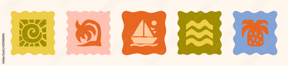 Summer Beach Illustration Set. Groovy Geometric Sun, Palm Tree, Sea Waves, Sailboat and Pineapple. Vector Abstract Square Tropical Icons in Freehand Retro Style for Logo, Print, Pattern, Poster #1391488414