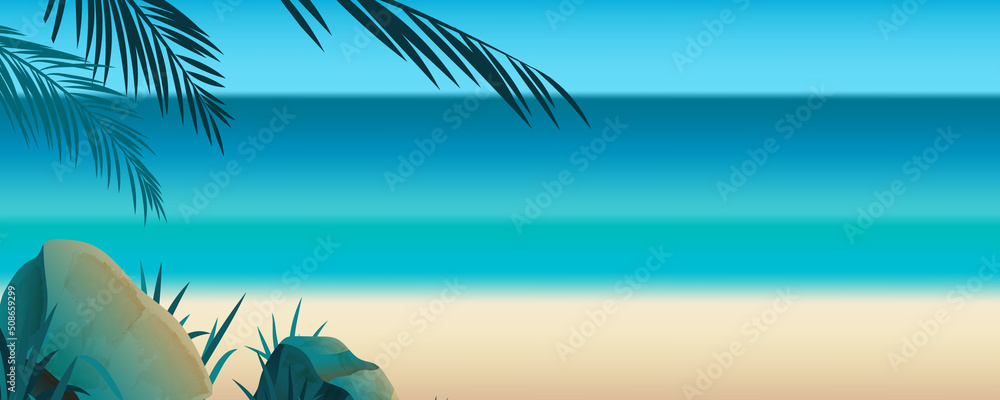 Summer blank horizontal banner , template for social media, ads. Vector Summer banner in beautiful seaside landscape with palm branches. #508659299