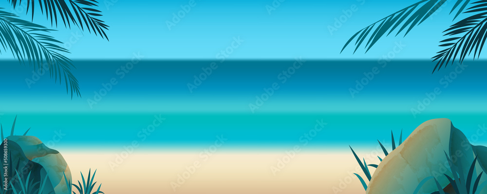 Summer blank horizontal banner , template for social media, ads. Vector Summer banner in beautiful seaside landscape with palm branches. #508659300