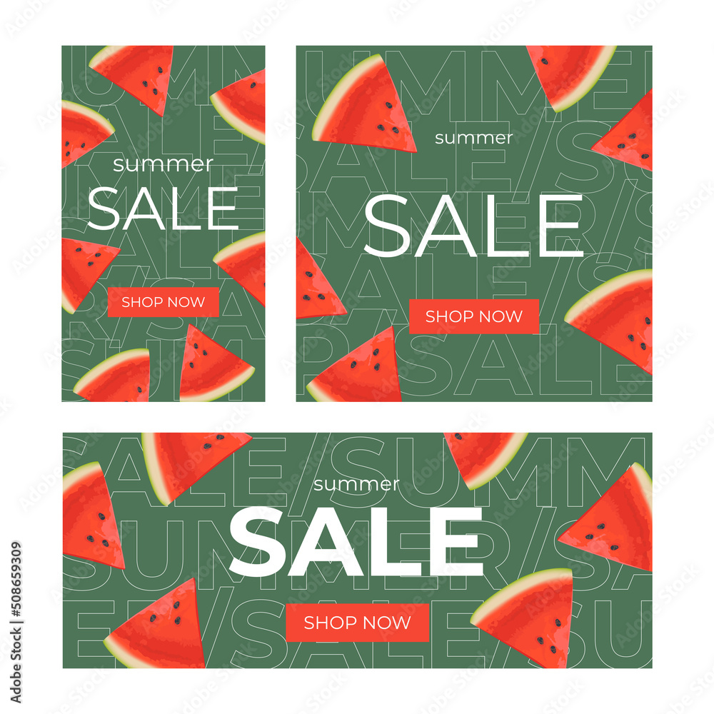 Summer sale banner set, template for social media, stories, ads. Vector Summer sale banners in modern design with watermelon slices. Collection of vertical, horizontal and square banners. #508659309