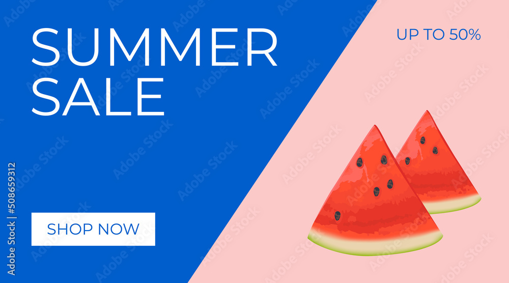 Summer sale horizontal banner, template for ads. Vector Summer sale banner in modern design with watermelon slices. Banner with button "Shop now". #508659312