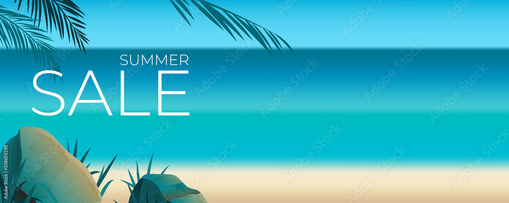 Summer sale horizontal banner , template for social media, ads. Vector Summer sale banner in beautiful seaside landscape with palm branches. #508659298