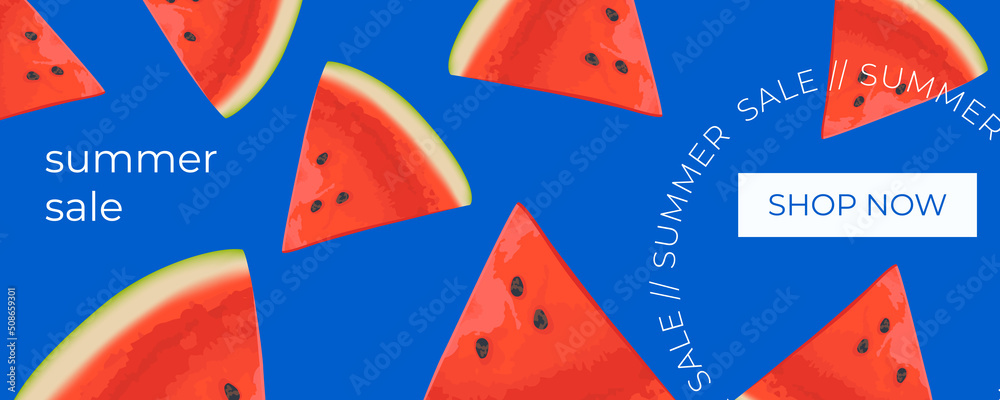 Summer sale horizontal banner , template for social media, ads. Vector Summer sale banner in modern design with watermelon slices. Banner with button "Shop now". #508659301