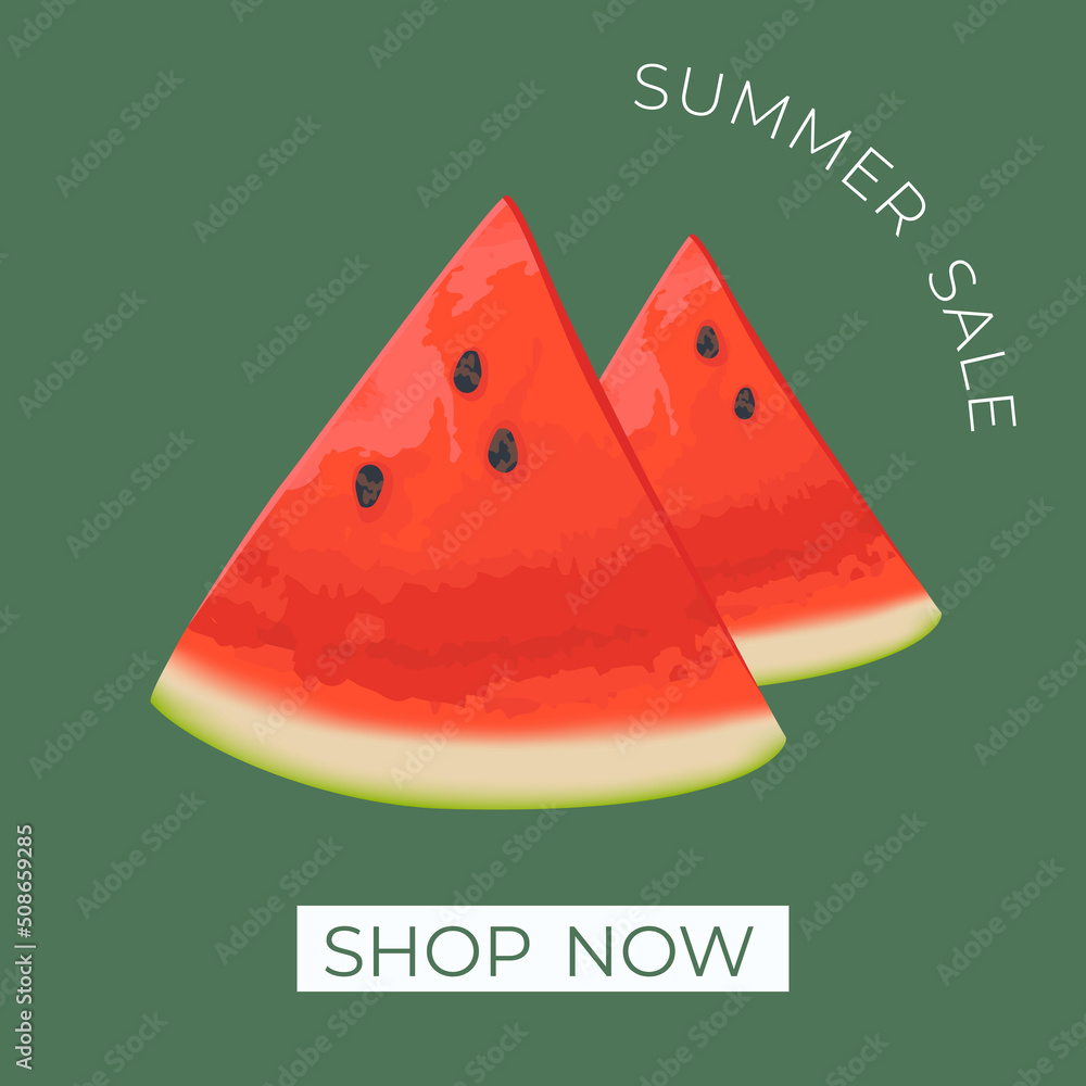 Summer sale square banner , template for social media, ads. Vector Summer sale banner in modern design with watermelon slices. Banner with button "Shop now". #508659285