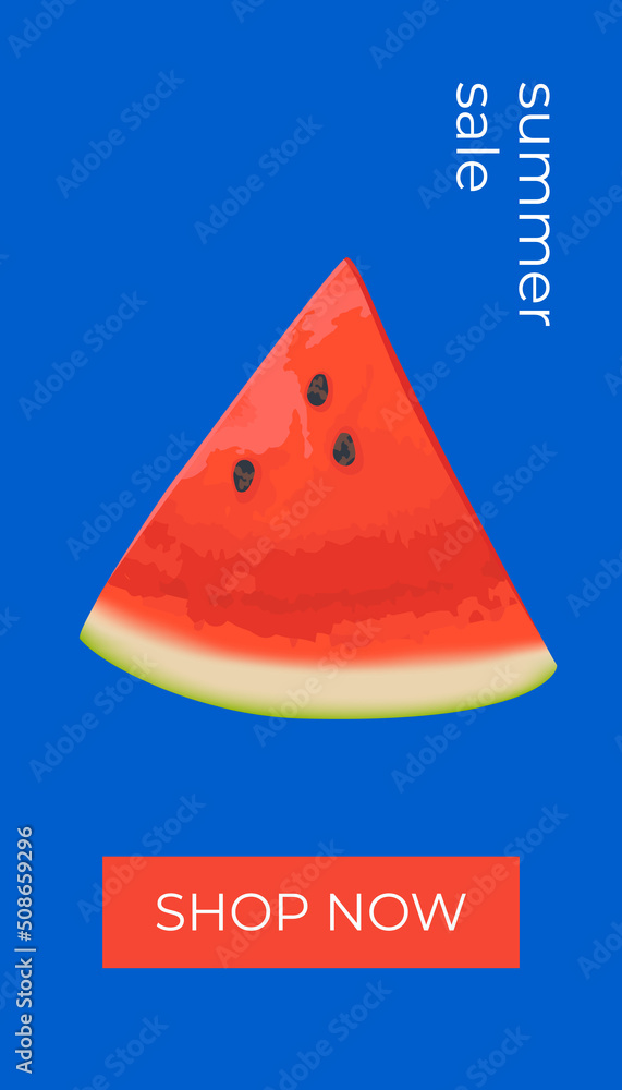 Summer sale vertical banner , template for social media, ads. Vector Summer sale banner in modern design with watermelon slices. Banner with button "Shop now". #508659296
