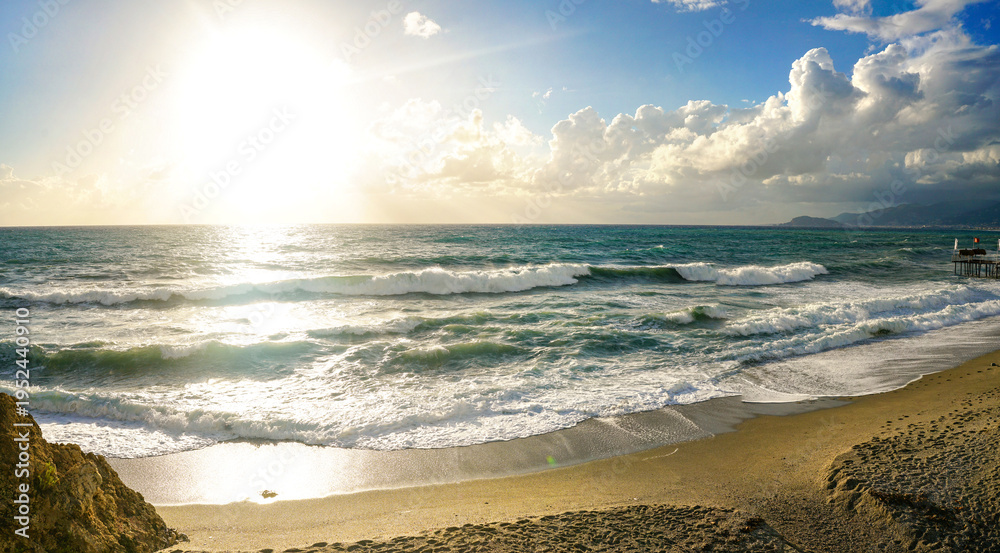 Sunny beach with waves and cloudy sky on a summer day #1952440910