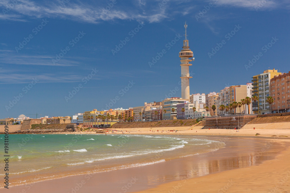 Sunny coastal view of La Caleta beach in Cadiz, Spain, with sandy shore, gentle Atlantic waves, city skyline, and Tavira tower in the background. #1981106090