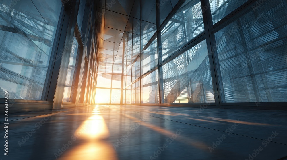 Sunny Modern Office Interior with Glass Walls and Bright Sunset Light. #1737607729