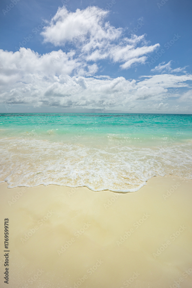 Sunny Summer Beach Landscape with Calm Blue Sea Waves washing on White Sand. Minimal and Tranquil Tropical Mediterranean Background under a Bright Sky. Relaxing and Perfect for Exotic Holiday Travel #1769599713