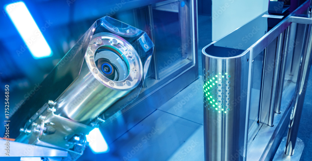 Surveillance camera and access control turnstile with green light indicator, concept of security, monitoring and restricted area protection. Security. #1752546850