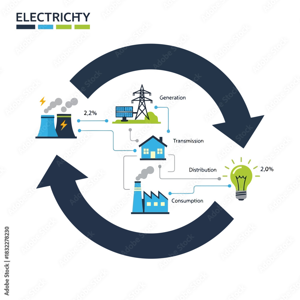 Sustainable Electricity Cycle Concept: From Power Generation to Home Consumption, Showing Energy Distribution for Infographics and Educational Material #1832278230
