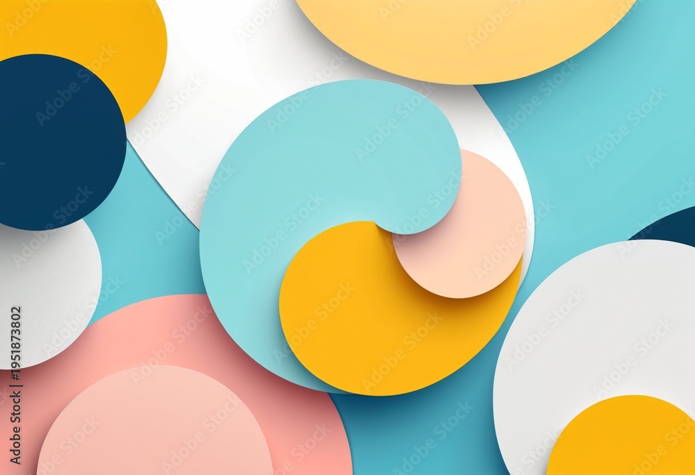 swirling abstract composition of overlapping circles and curved shapes in teal yellow blue and pink colors with a minimalist layered look. #1951873802