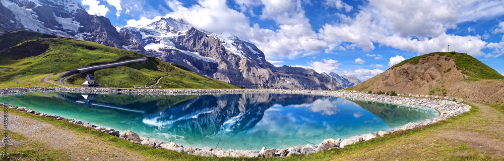 Switzerland nature . panoramic view of Fallboden lake with turquoise water and reflections of snowy peaks. Kleine Scheidegg mountain pass famous for hiking in Bernese Alps. Swiss travel #1555865881