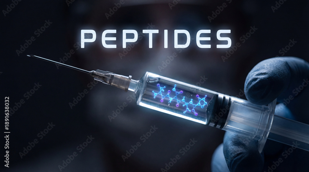 Syringe Containing Peptide Molecules Held by Gloved Hand, Highlighting Biohacking and Longevity Advances. Image Made Using Generative AI. #1891638032