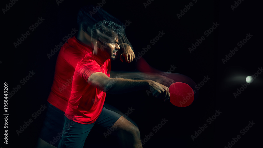Table tennis player reacting to fast ball with motion blur in dark studio. Concept of reaction speed training, reflex development, quick response ability and athletic performance improvement. #1958449209