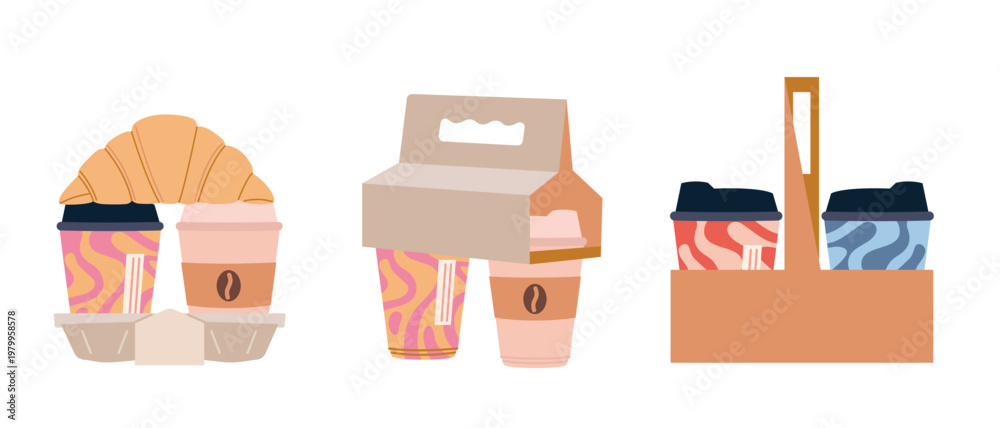 Takeaway set with coffee, croissant, cardboard carrier holder and tray. Breakfast and street food concept for cafe and bakery menu. Trendy modern vector illustration isolated on white, flat design #1979958578
