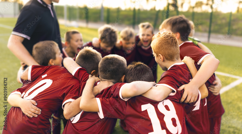 Team Sports for Kids. Children Sports Soccer Team. Coach Motivate Soccer Players to Play as a Team. Boys Kids Soccer Football Game. Young Children In Huddle Building Team Spirit. #903914712