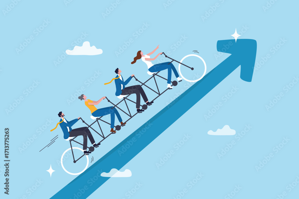 Teamwork growth success together, collaboration or cooperation help support colleagues, motivation or union support, leadership, business people riding bicycle together on career growing arrow. #1713775263