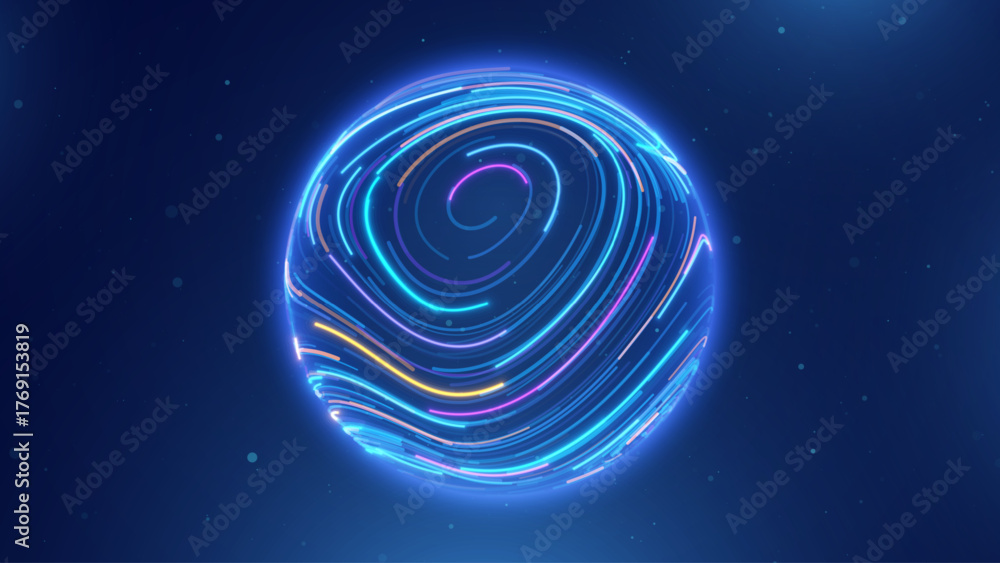 Tech Neon Lines Energy Orb. 3D Sphere Science Globe With Abstract Glowing Lines Representing Microbiology, Cell Research, or Nanotechnology On Dark Blue Background. Vector Illustration. #1769153819