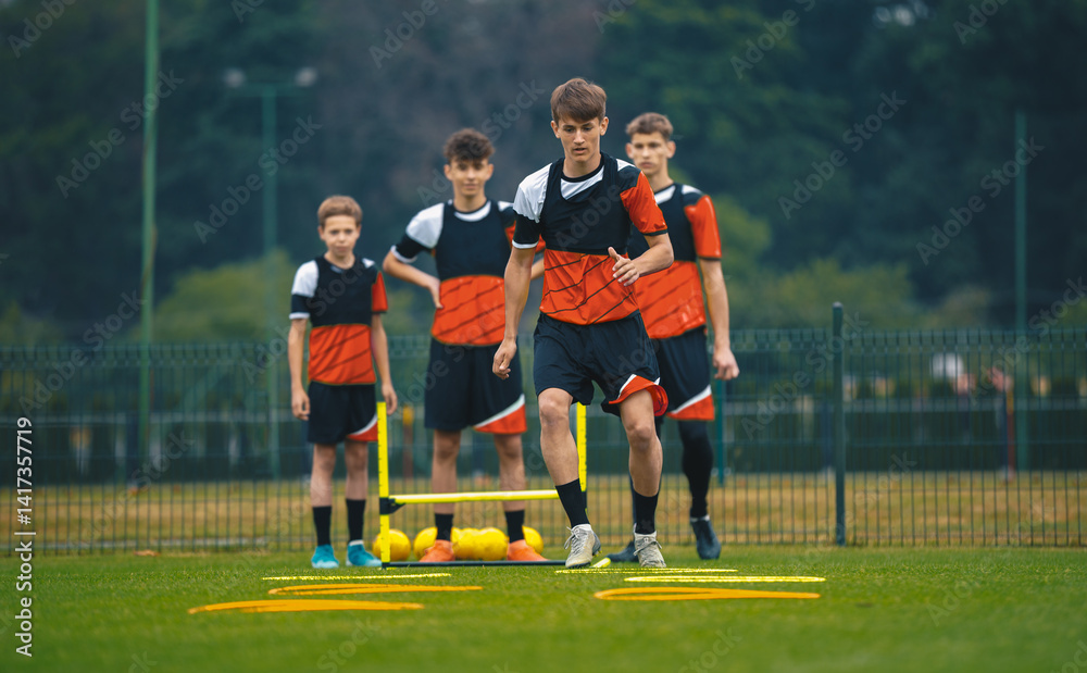 Teen soccer players train on a field, practicing agility drills with yellow hoops and cones. Football summer camp for youth players. Teammates in soccer practice outdoors #1417357719