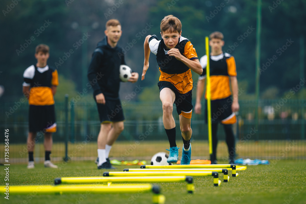 Teenage Boy at Training Drill With Young Soccer Coach. Youth Football Player Jumping Over Row of Hurdles and Running Fast at Sports Practice Field. Sports Strength and Agility Training For Footballers #1758368476