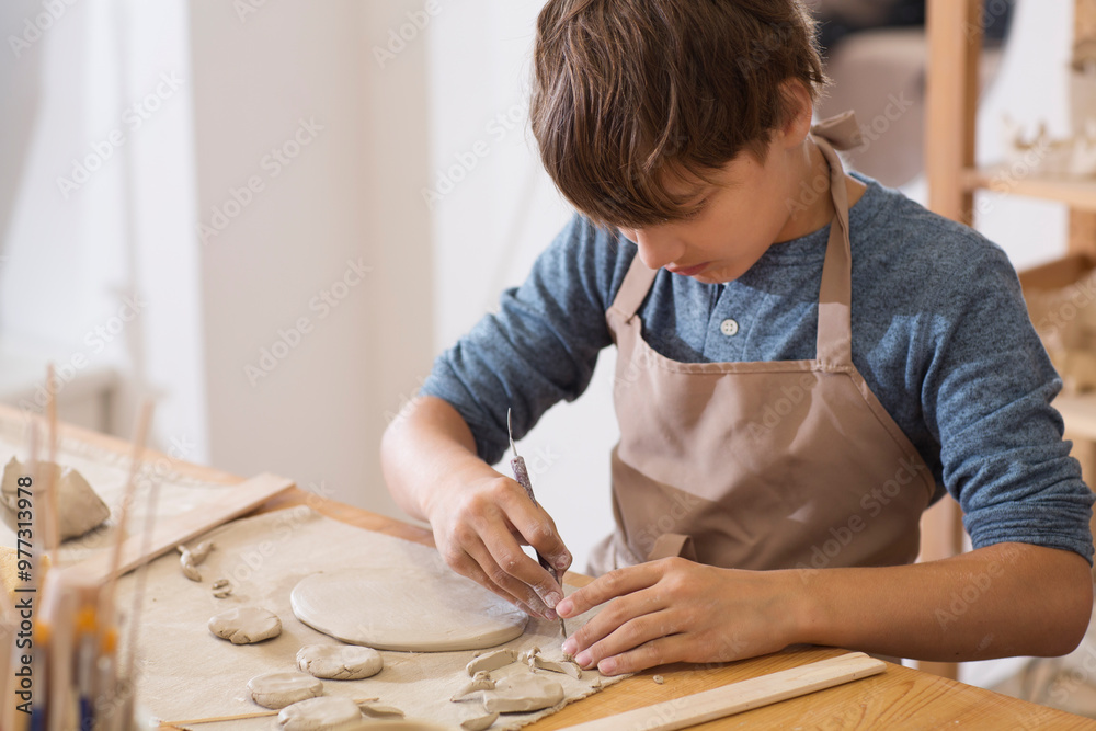 teenager boy works with clay makes ceramic plate in pottery school. Children arts a crafts class in workshop. child sculpts from clay #977313978