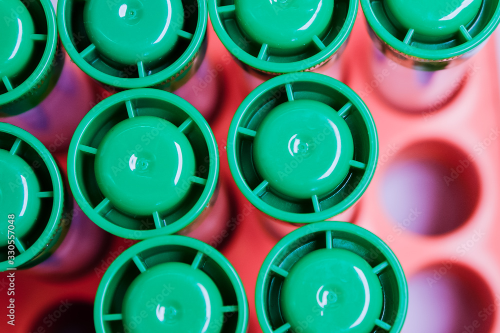 Test tubes in rack, view from above. Concept of science, laboratory and study of diseases. #330557048